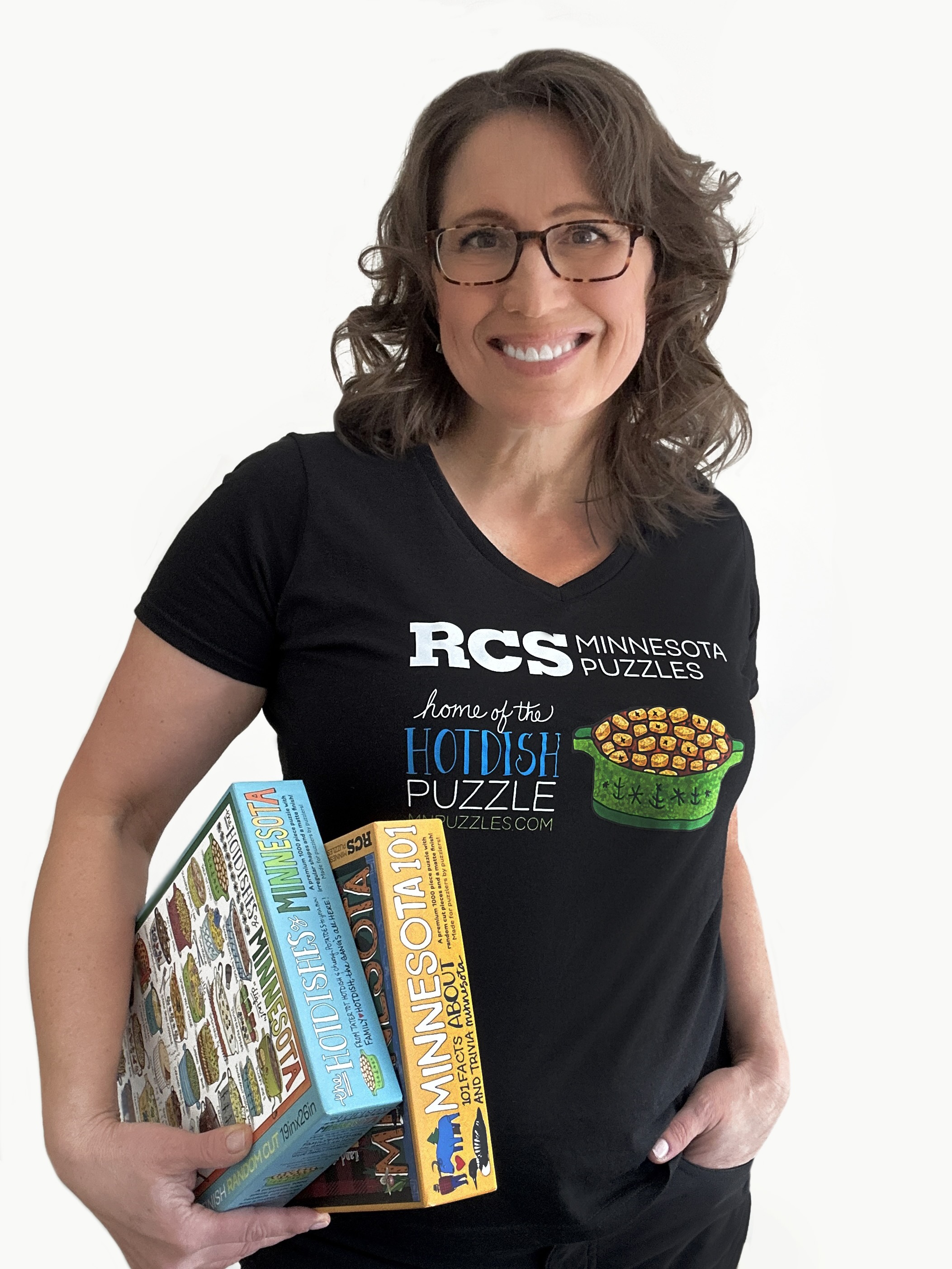 Her puzzles are packed with personal touches, which is her favorite part. You’ll spot nods to the towns she’s lived in, a red barn from the farm where she grew up, and familiar comforts like hotdish and s’mores. Melanie also does all the hand lettering herself, even creating a custom font for the puzzles. It’s very much a family affair: her sister Gayle helped illustrate MN Trivia and MN Not-So-Nice, her mom Susan offers ideas and color guidance, and her husband Mike inspired a few drawings and a forest fire detail from his work as a wildland firefighter. Their adult kids, Jensen and Elise, help with sales, and a few family pets appear in the artwork too. Melanie is always dreaming up new designs, often inspired by the little moments, roadside sights, and local quirks she notices around Minnesota. And in her spare time, she puzzles!